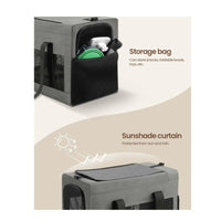 - Features: Collapsible Frame, Storage Pocket, Sunshade, Safety Zippers, Seat Belt Loop